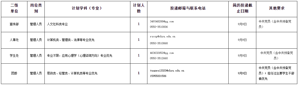 根据工作需要,滁州学院(http://www.chzu.edu.cn)现面向社会公开招聘管理岗位工作人员。根据学校人才引进有关规定,现就有关事项公告如下: