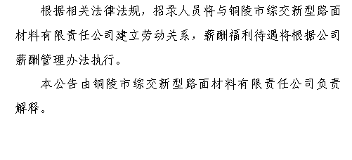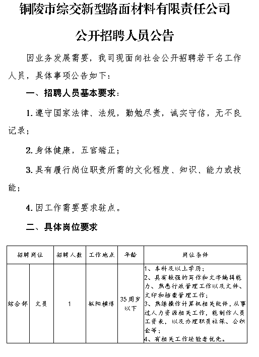铜陵市综交新型路面材料有限责任公司公开招聘人员公告
