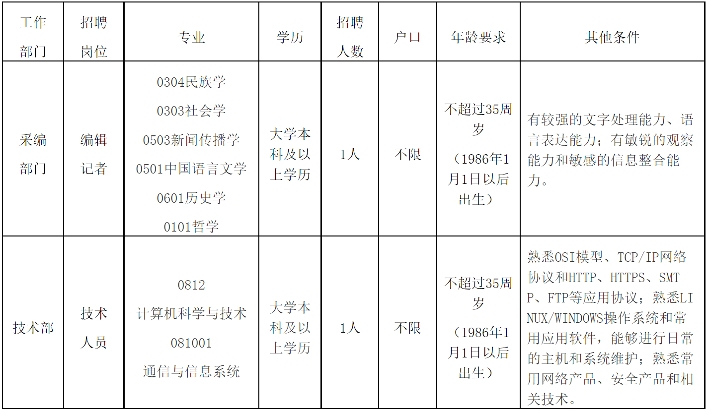 根据《事业单位公开招聘人员暂行规定》《国家民委直属事业单位公开招聘人员暂行办法》和国家民委人事司《关于下达2021年度公开招聘计划的函》等文件精神和要求,结合报社发展需要,中国民族报社面向社会公开招聘共2名(解决事业编制,不解决北京市户口),其中采编人员1名,技术人员1名。