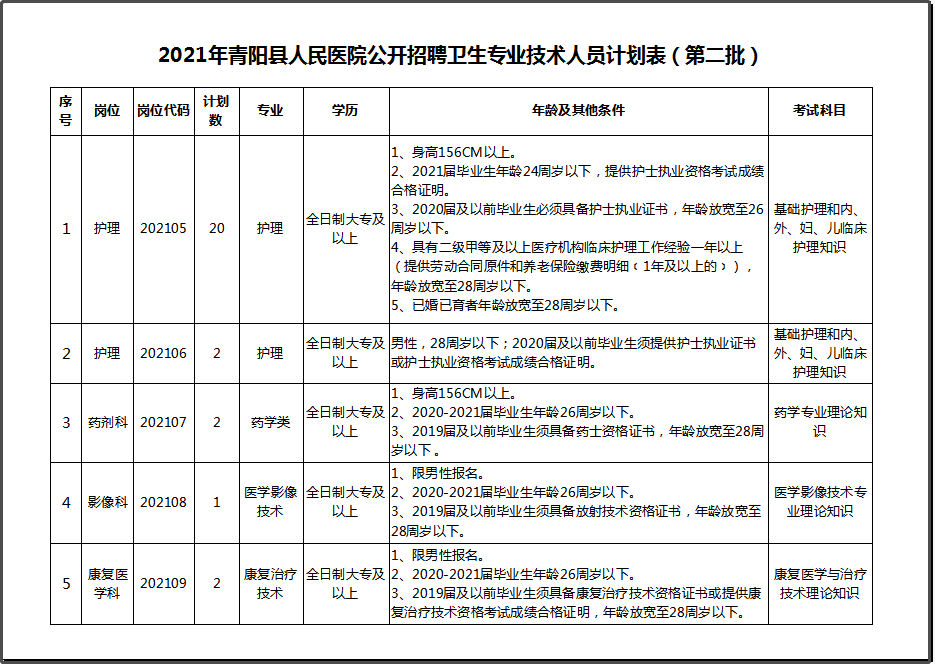 招聘对象须具有招聘岗位所需条件具体详见附件(2021年青阳县人民医院公开招聘卫生专业技术人员计划表〔第二批〕)且必须符合以下条件: